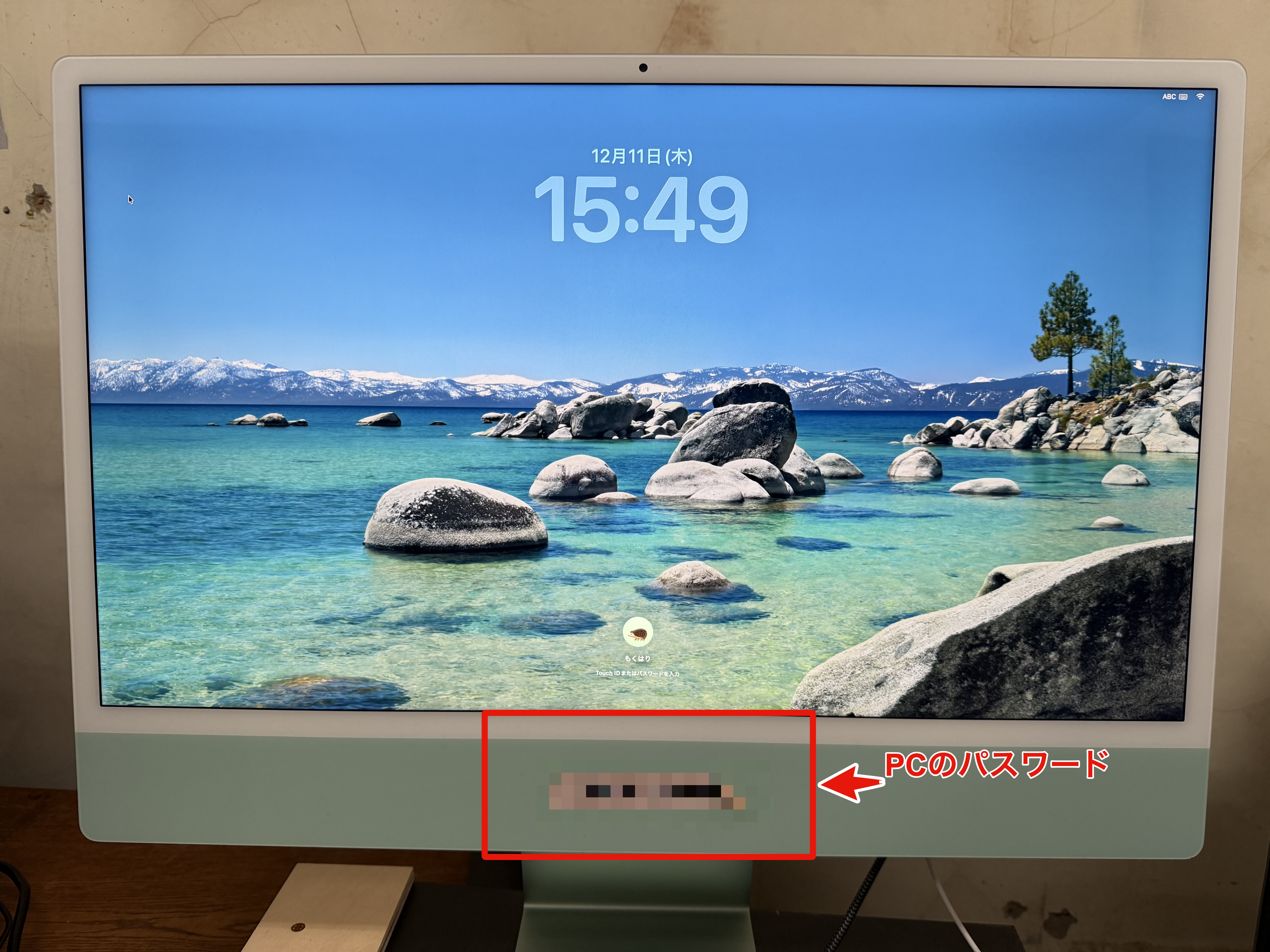 PCのパスワードは画像の場所に書いてあるワードを打ち込んでください。